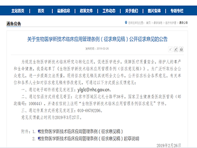 2019年2月26日,医政医管局在首页发布通告——《关于生物医学新技术临床应用管理条例(征求意见稿)》(以下简称《应用管理条例》)。在《应用管理条例》指出,为规范生物医学新技术临床研究及转化应用,促进医学进步,保障医疗质量安全,维护人的尊严和生命健康,我委起草了《关于生物医学新技术临床应用管理条例(征求意见稿)》,现向各界人士征求修改意见,以保证立法质量的提高。