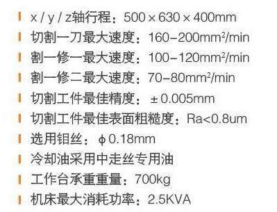 1、 机械部分特点: 1)、独创走丝机型设计外观精美,主机为“C”型结构,大壁厚采用优质300号米汉纳树脂砂铸件, 坚固紧凑、整体刚性好。 2)、采用大跨距十字滑台,XY轴支撑导轨间距宽,稳定性好,承载能力强。 3)、采用优质的钢工作台,确保切割较重工件时台面不变形。 4)、铸件的导轨安装面,经高精度导轨磨床磨削加工,导轨面的平行度,垂直度,直线度大大改善,安装精度更高。 5)、导轨采用台湾上银精密级滚珠直线滑轨,丝杠采用P2级进口YG单螺母精密滚珠丝杠副,定位精度高。 6)、线性光栅数显尺直接检测导轨的实际移动量,并可消除所有通常由丝杠的间隙,热膨胀或磨损引起的误差。 7)、封闭式镶宝石丝嘴结构使得运丝更加平稳,加工精度更高。 9)、机床各关键零部件,都经三坐标严格检测。各轴定位精度均用激光干涉仪进行检测,机床精度得到可靠保证。 10)、Z轴手动升降,免去上线架,上下移动,拆装丝的烦恼;并可贴面加工,稳定钼丝跳动,提高精度与光洁度。 11)、手动(选配自动)加油装置,可定时给导轨﹑丝杠加油,提高了导轨﹑丝杠的使用寿命。 12)、运丝速度可无极变速,适应多次切割和机动上丝。 13)、大容量贮丝筒,提高了切割效率,延长了丝的使用寿命。运丝部分采用全封闭式护罩设计,外观更漂亮,使用更环保。 14)、采用宝石导轮,延长导轮使用寿命,稳定钼丝运行,提高精度,保证稳定性。 15)、可选配大锥度摇摆装置,保证切割大锥度工件时的加工精度和光洁度。 2、 水箱部分特点: 1)、容量大,可以容纳更多的沉淀物,延长工作液的使用时间。 2)、仿慢走丝进水原理设计,保证了进水供给的纯净。 3)、过滤系统滤芯采用慢走丝不锈钢滤清器,过滤精度可达10µm。 4)、只需在使用过程中不断添加损耗部分的工作液,可实现一个月不换水。 5)、采用高压水泵,质量稳定、水压可达15米扬程、排泄效果好。 6)、整体实现的结果是:改善了电火花放电后的排泄状态、火花放电状态、加工光洁度等。 3、 电柜部分特点: 1)、数控系统选用AutoCut编控一体化软件,显示器为15寸液晶屏,采用高可靠性、稳定性、高抗干扰台湾工控主机,奔四双核处理器。 2)、电柜采用高性能全数字脉冲电源、主振电路高速数字振荡、大功率VMOS场效应管、频率可调,具有性能稳定、输出功率大、切割速度快、表面光洁度高、电极丝损耗小等特点。 3)、AutoCut控制软件具有上下异性形、等锥、变锥切割、分时控制、停电记忆、短路回退、断丝保护、靠边定位、模拟校验、自动停机、自动找中心、编程任意角度旋转快速回零、特殊图形自动等二十多种功能.。 4)、可手动编程﹑单段加工﹑修改加工条件﹑加工时图形预演﹑可进行国际标准ISO代码控制,可读入DXF图形文件、G代码、3B代码;可进行编辑﹑装入﹑存盘﹑换名﹑删除﹑清除;局域网及USB传输程序文件。 5)、具有丰富的拐角策略﹑防断丝功能﹑掉电记忆功能;可四轴同动,进行上﹑下异 型常规锥度切割。 6)、亿光中走丝控制柜板金材料采用国标1.5mm冷扎钢板,经数控冲床精密冲压,焊接成型。 7)、控制柜经RAL7035防水侵蜡及粉末底漆处理织纹饰面,能有效防止油漆脱落,永保漆面光亮如新。 8)、控制柜采用防尘、防水、放电磁干扰的三防设计。(防护等级达到IP53) 9)、大功率电阻采用独立散热系统,可节约大量电能。 10)、控制柜采用人体工程学设计: A、显示器采用平面式安装,使用起来更直观,操作更便捷。 B、102键键盘,倾斜45°安装,便于操作。 4、 整机性能指标: 1)、高效率:效率一刀最高可达10000 mm²/小时, 方便实现多次切割,割一修二最高可达4500mm²/小时; 正常加工一刀可达7500 mm²/小时,割一修二可达3500mm²/小时;各项性能指标无限接近慢走丝。 2)、高精度:5µm光栅控制,加工精度提高至±5µm。 3)、低粗糙度,模具钢达:Ra1.0µm,钨钢达Ra0.8µm。 4)、机床噪音:符合使用国家标准 5)、机床具备国家使用的安全、环保要求 6)、具备在上述技术指标符合的条件下长期可靠稳定的工作 7)、机床设计制造符合ISO国家标准,通过国际质量认证体系ISO9001—2001质量认证。 8)、机床所有零部件和各种仪表的计量单位全部采用国际单位(SI)标准